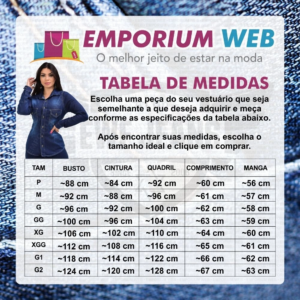 No anúncio há uma tabela com as medidas em centímetros para que você compre o tamanho ideal. Para compras realizadas na internet é de extrema importância conferir as medidas, pois não realizamos troca por erro do cliente. A tabela encontra-se nas fotos e na guia de tamanhos.